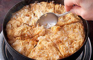 鍋の旨みが凝縮された〆の『おじや』はコゲが旨い逸品。すき焼きに使用した溶き卵をかけることで、自分だけのオリジナルの味わいに仕上がっています