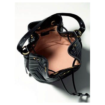 なめらかなカーフレザーにグラマラスな個性を授ける、シェブロンのキルティングが施された巾着型バッグは、同素材のレザーと「ウェブ」と呼ばれるストライプ、個性の異なるふたつのストラップ付き。