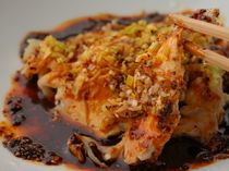 蒸した鶏肉に麻辣醤のタレをたっぷり。仕上げに熱々の油をかけることで、香ばしい音と香りも楽しめます。620円