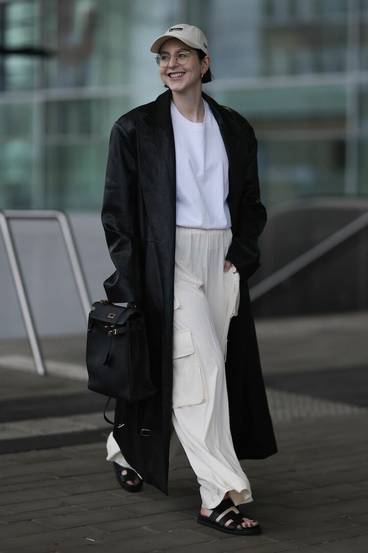 ぴりっとスパイシーな黒レザーコートに、真逆な印象のカジュアルな白ワイドカーゴパンツを合わせ、色とテイストでメリハリを演出。色味を変えた白アイテムを取り入れ、定番モノトーンに奥行きをプラス。