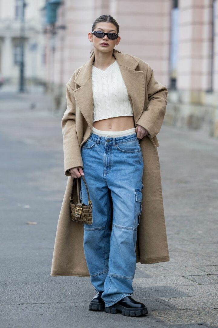 ショート丈がフレッシュな白ケーブルニットには、アクティブなブルーのカーゴデニムパンツがお似合い。チャンキーソールの黒ブーツで受け止め、引き締めを実行。仕上げにベージュのウールコートを重ね、しなやかさを足すと大人らしく着地します。