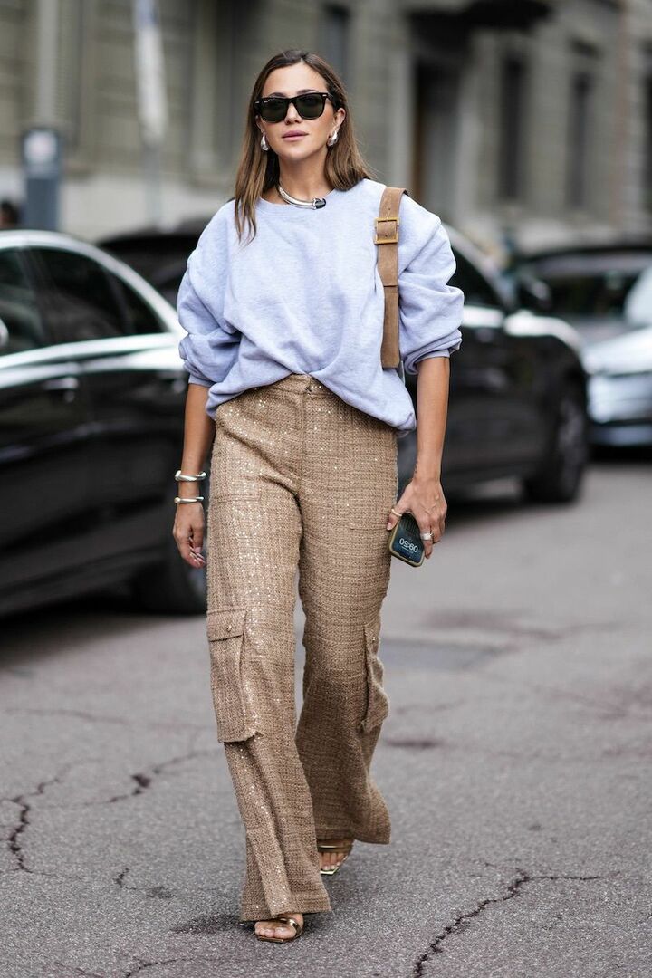 動きやすく快適なスウェットプルオーバーと相性がよいカーゴパンツ。ベージュ×ツイードなら品のよさを加えることができ、クラスアップが叶います。さらにトップスの裾をラフにインして、動きをつけながら脚長効果を獲得。
