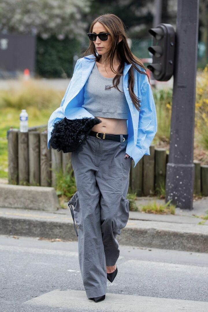 グレーリンクの上下が間延びしないように、肌見せして境界線を明確にしつつ、カーゴパンツを迎え立体感を獲得。寒色である水色シャツをさらりと重ねれば、カーゴパンツのクールな持ち味をきわ立てることができます。