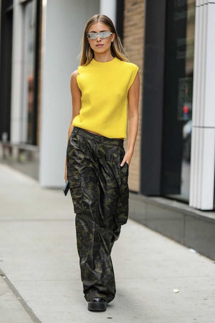 ぱっと視線を引き付けるブライトイエローのトップスに、メリハリたっぷりなカーキのカモフラージュ柄カーゴパンツを掛け合わせキャッチーさを実現。しなやかな形のトップス、タック入りのパンツなら、キレイを両立することができます。