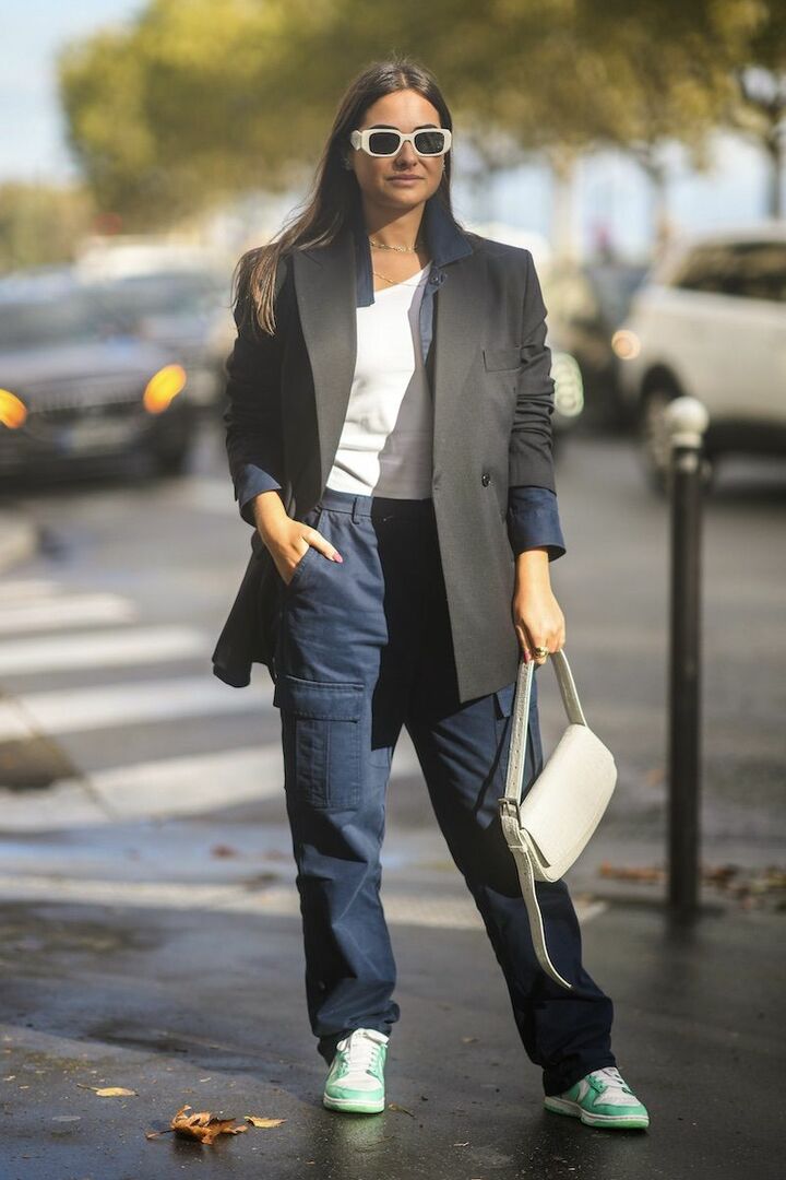 シャツとカーゴパンツのネイビーセットアップに、白トップス、グリーンスニーカーを合わせカラー×カラーが小気味よい大人ストリートをメイク。黒ジャケットを重ねて格好よさを倍増させながら、奥行きを生み出して。
