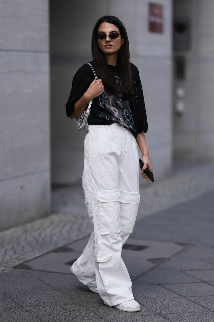 慣れ親しんだシンプルな白黒コーディネートは、カーゴパンツを採用して動きをつけながらアクティブさを演出。ワイドシルエットのパンツなので、トップスはコンパクトなキャミソールを選ぶとメリハリラインを描けます。
