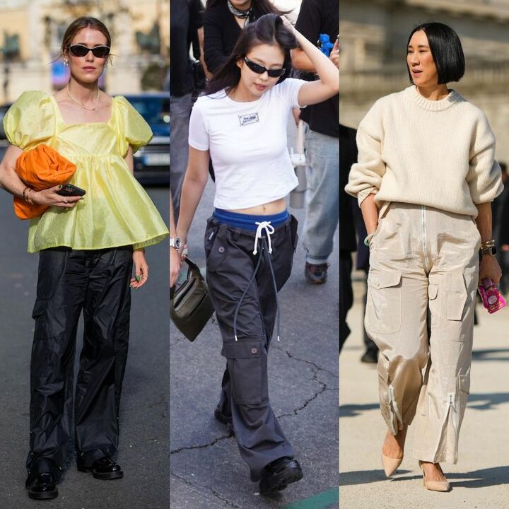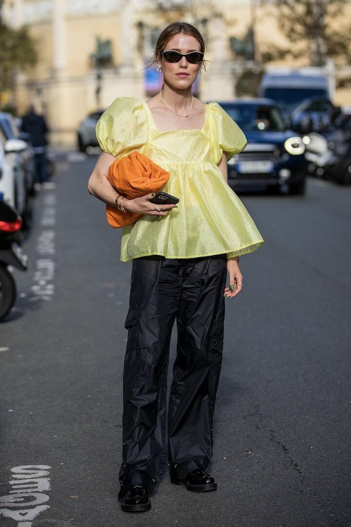 チアフルなブライトイエローやパフスリーブが華やかなブラウスは、かっこいい黒カーゴパンツでクールダウン。光沢感のあるシャカシャカ素材なら軽快さを演出でき、ポジティブなイエローにもしっくり。