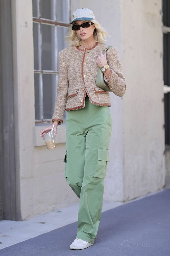 グリーンのカーゴパンツ、オフホワイトのスニーカー、それぞれの色とリンクしたバイカラーキャップのカジュアルルックに、グッドガールなベージュのツイードジャケットをプラスしていたエルザ・ホスク。異なるテイストながら、トーンを揃えたことで一体感が生まれています。淡い色調で品のよさをクリア。