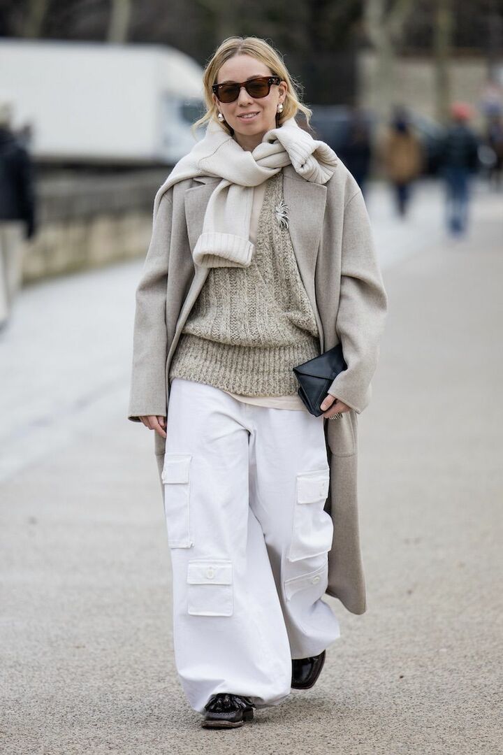 ほんのりとグレイッシュなベージュと白で作る、優しげなニュアンスカラーコーディネート。ほっこりしたりぼんやりするのを避けるために、パンツはアクティブで軽やかなワイドカーゴパンツをセレクト。