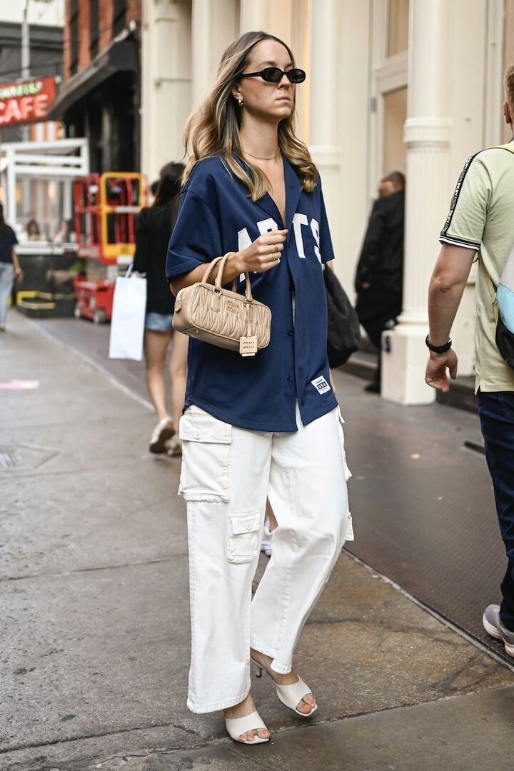 タンクトップとデニムパンツ、スニーカーのミニマルルックが様になっているのは、ローライズのカーゴパンツがポイントになっているから。白とライトブルーの清々しい配色が切れ味のよさを演出。ベージュのレザーバッグを添え、きちんと感をひとさじ。
