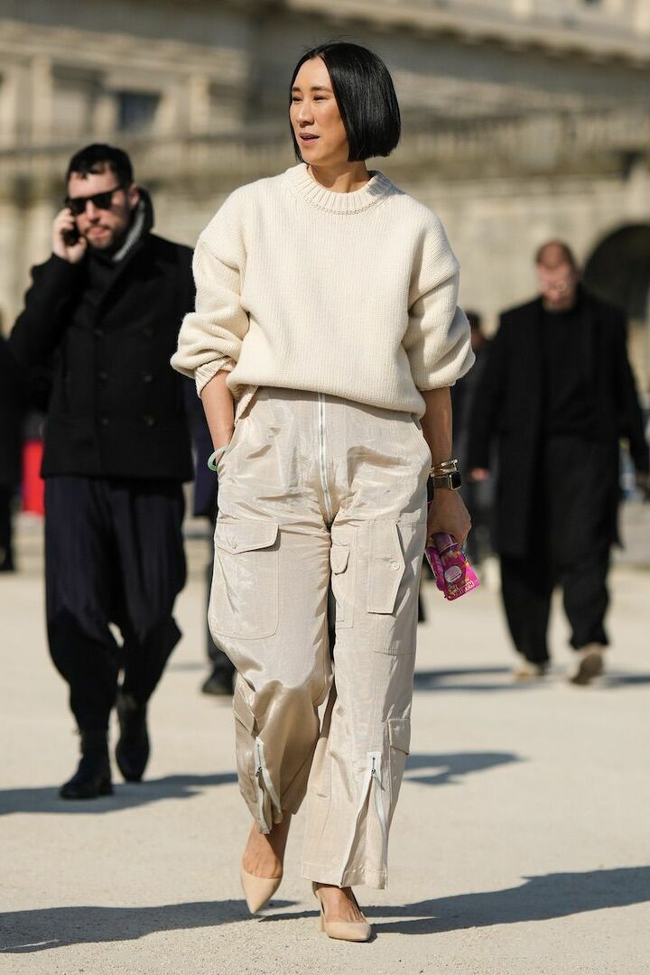 クリームホワイトのニットとライトベージュのカーゴパンツを合わせ、アクティブなワンツーをしなやかに昇華。曖昧カラーのワントーンがのっぺりしないよう、パンツのツヤ素材を頼りに。さらに先の尖ったベージュパンプスがエレガンスを漂わせます。