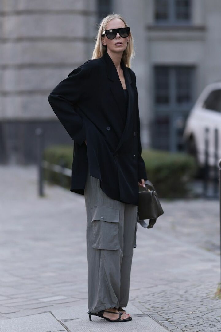 オーバーサイズがモードな黒ジャケットに、カーキのカーゴパンツを合わせてスパイスを増量させ、ハンサムに振り切るとオーラ抜群。足元にはレディな華奢ストラップサンダルを迎え、シルエットに強弱をつけて。
