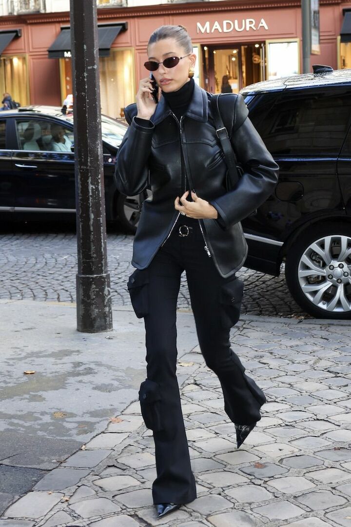 ぴりっとスパイシーなブラックコーディネートを披露したヘイリー・ビーバー。太もも、膝下にポケットがあしらわれたカーゴパンツが、黒一択の装いに立体感を授けます。またフレアシルエットになっているため、しなやかさを共存させることに成功。
