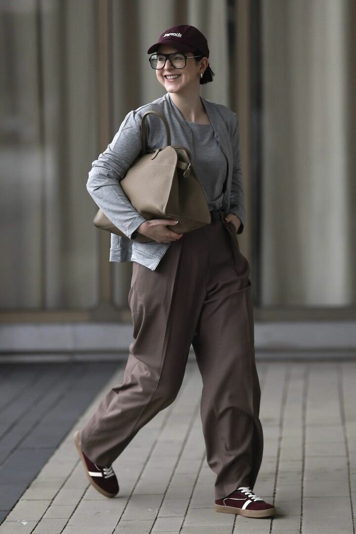 グレーとブラウンにバーガンディを差した穏やかな配色に任せ、カジュアルを大人顔に誘導。さらにセンタープレスパンツが上品さを倍増してくれるので、ラフにならない理想のバランスに。