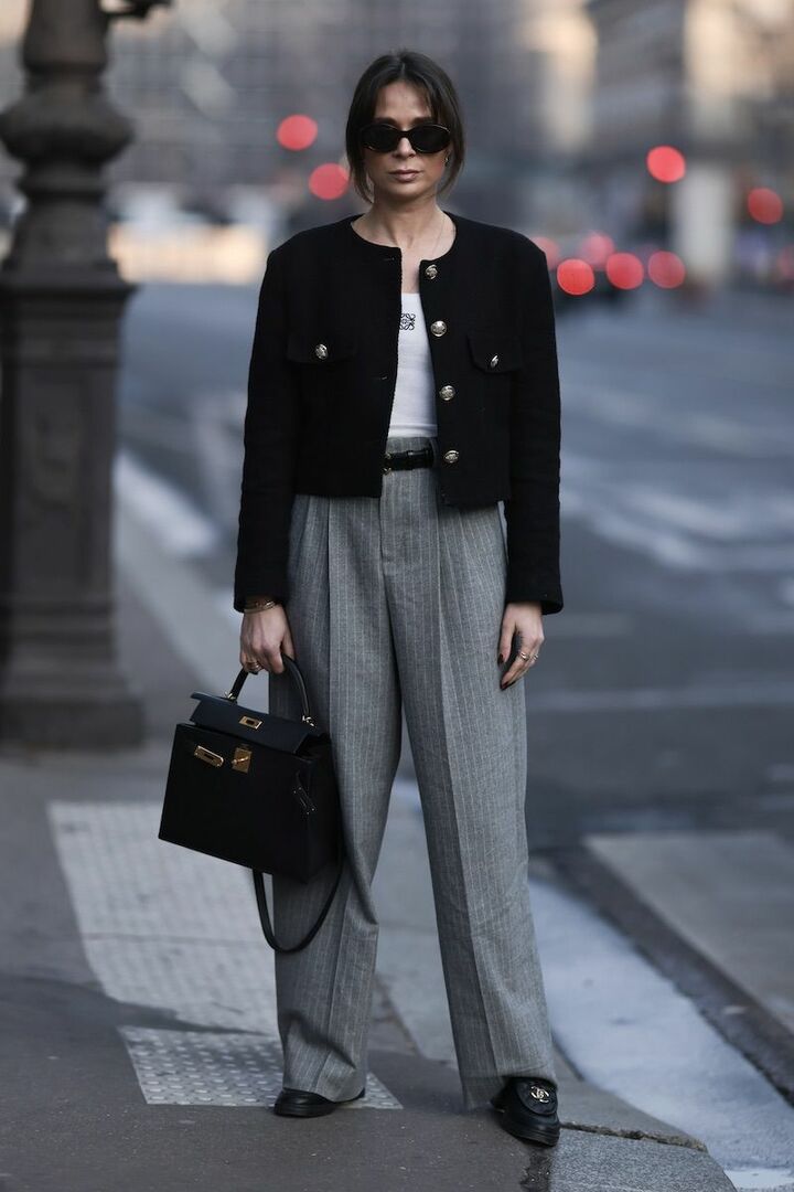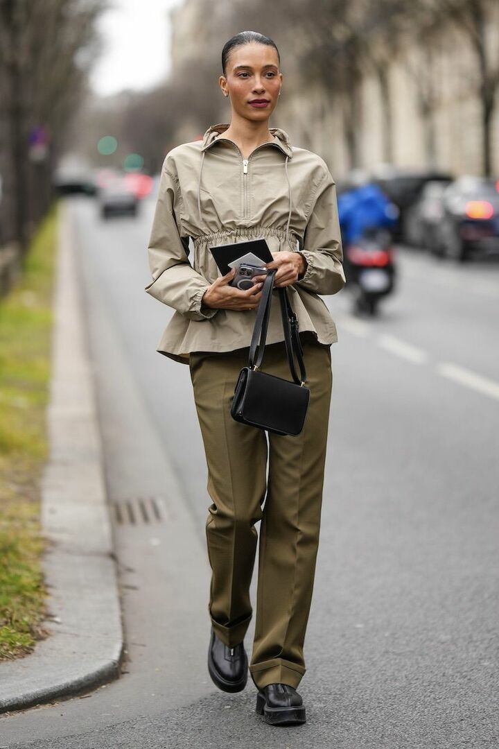 テイストミックスなモノトーンスタイルを披露したオリヴィア・パレルモ。パンツのセンタープレスがくっきりと浮かび上がって、ワンカラーの間延びを解消することに成功しています。アクティブなショート丈の黒ブルゾンを重ね、すらっと脚長に。