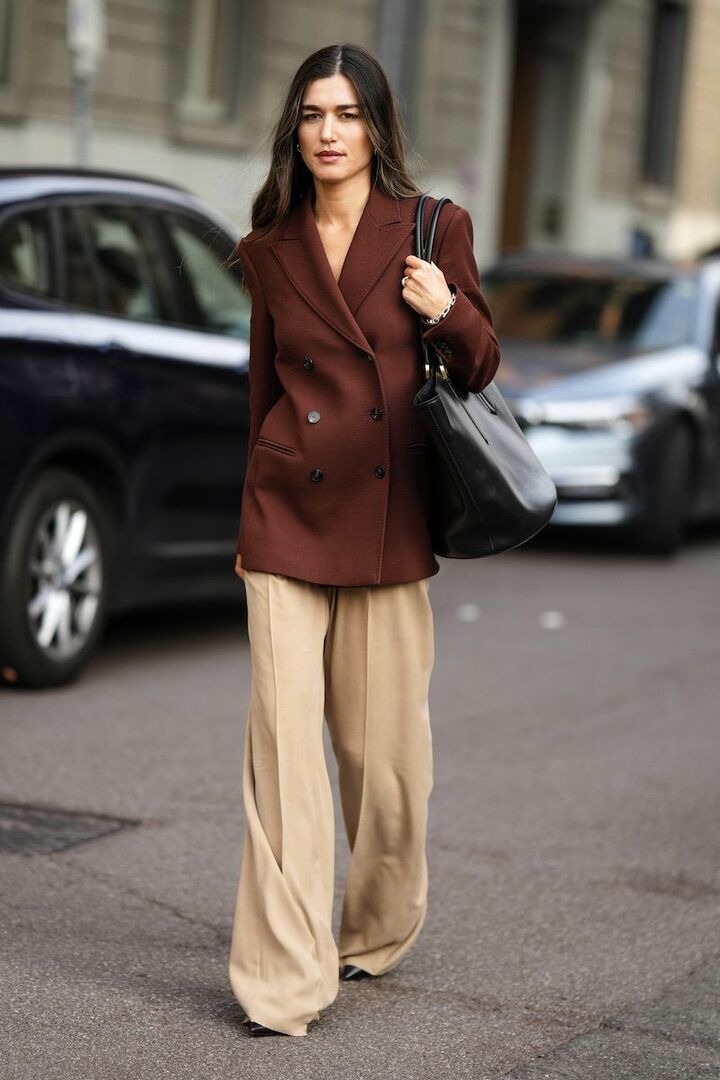 ダブルジャケットとセンタープレスパンツのきれいめスタイルは、ブラウンとベージュの配色が品のよさを加速。フレアラインのパンツなら、優雅さをアシストできます。仕上げに黒のビッグレザートートバッグを投入して、スタイリッシュなムードを共存。