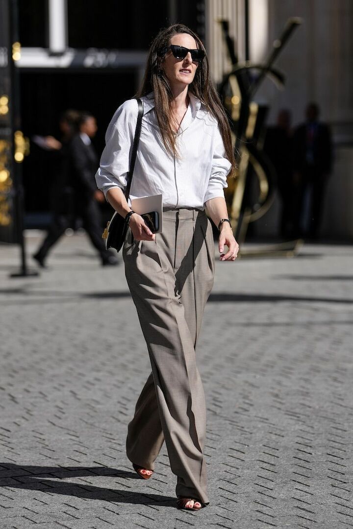 オフィススタイルとしても参考にしたい、白シャツとライトブラウンパンツの気品漂う着こなし。ピンストライプシャツの延長にパンツのセンタープレスラインを繋ぎ、すらりとしたシルエットをメイク。