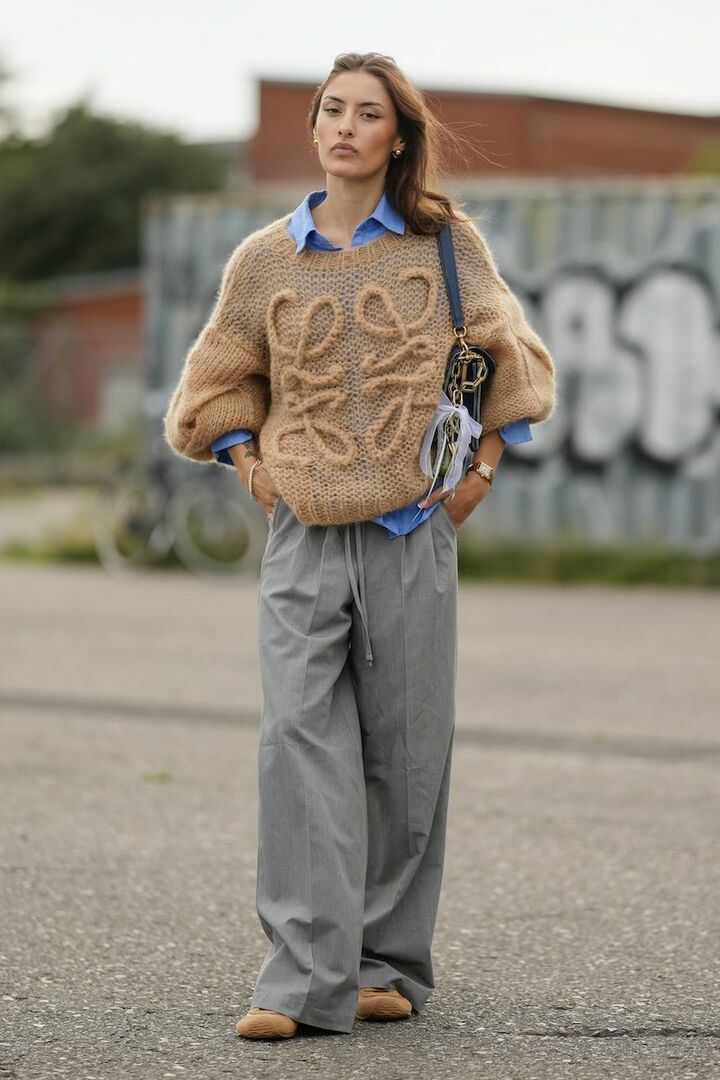 白シャツとベージュケーブルニットのプレッピーな組み合わせは、クロップド丈に更新して鮮度よく。そこにハイウエスト×センタープレスのパンツを加え、脚長効果を倍増。ベージュとカーキのアースカラー配色に、少量の白が効いて好バランスにまとまりました。