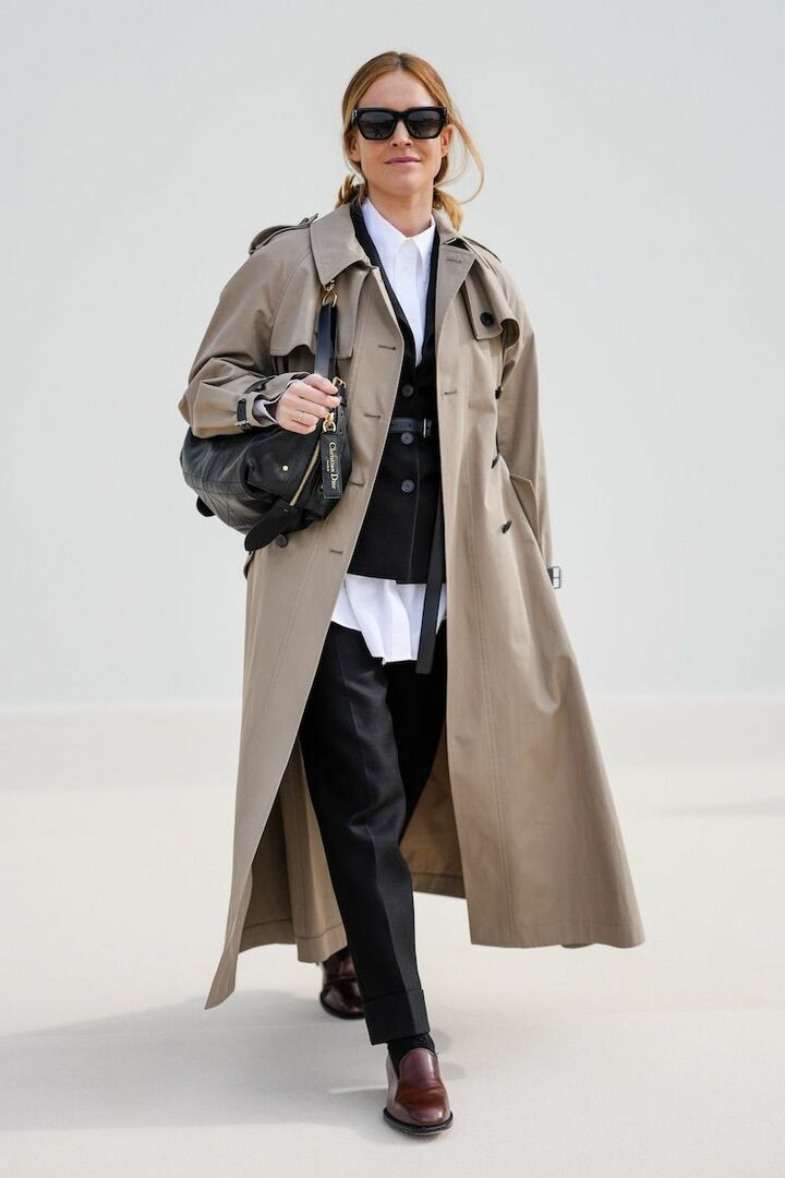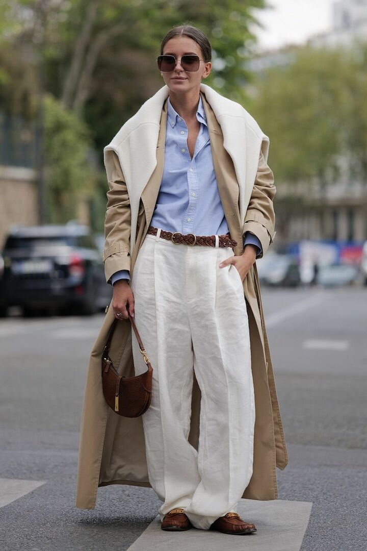 シャツ、トレンチコート、パンツのクラシカルコーディネートは、オーバーサイズにアップデートして余裕感をアピール。センタープレス入りのパンツをセレクトし、ゆったりシルエットがぼんやりしないように調整。上下にバランスよく白を配置したことで、軽快さもクリア。