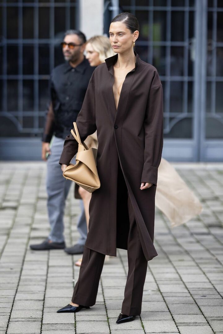 シャツワンピースとストレートパンツのセットアップを使って、楽して絵になる佇まいへ。センタープレスパンツで縦のラインを強調しながら、こっくり深みのあるブラウンを頼りにして優雅さを獲得。さらにワンピースのボタンはラフに留めてVネックを生み出し、シャープなキレのよさをプラス。
