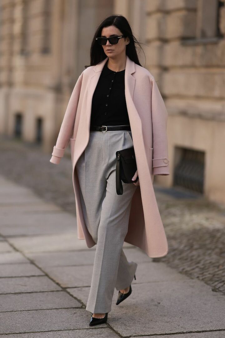 ふんわりとした色味が甘いピンクコートは、黒のカーディガン、生真面目なグレーのセンタープレスパンツと合わせることでシックに誘導。落ち感のあるコートとパンツに、ポインテッドトゥパンプスを添えきりっとシャープに整えて。