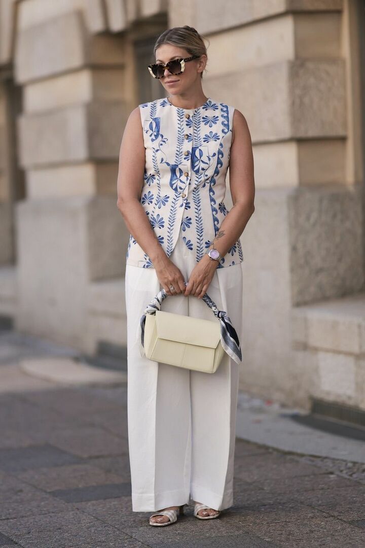 センタープレスがあるおかげで、白ワイドパンツも縦に落ちて美シルエット。さらにノースリーブのトップスを掛け合わせ、Iラインをメイク。ブルーのプリントが白と共鳴して涼感たっぷりです。ギンガムチェックのサンダルを効かせ、さりげなく柄×柄にしているのが粋。