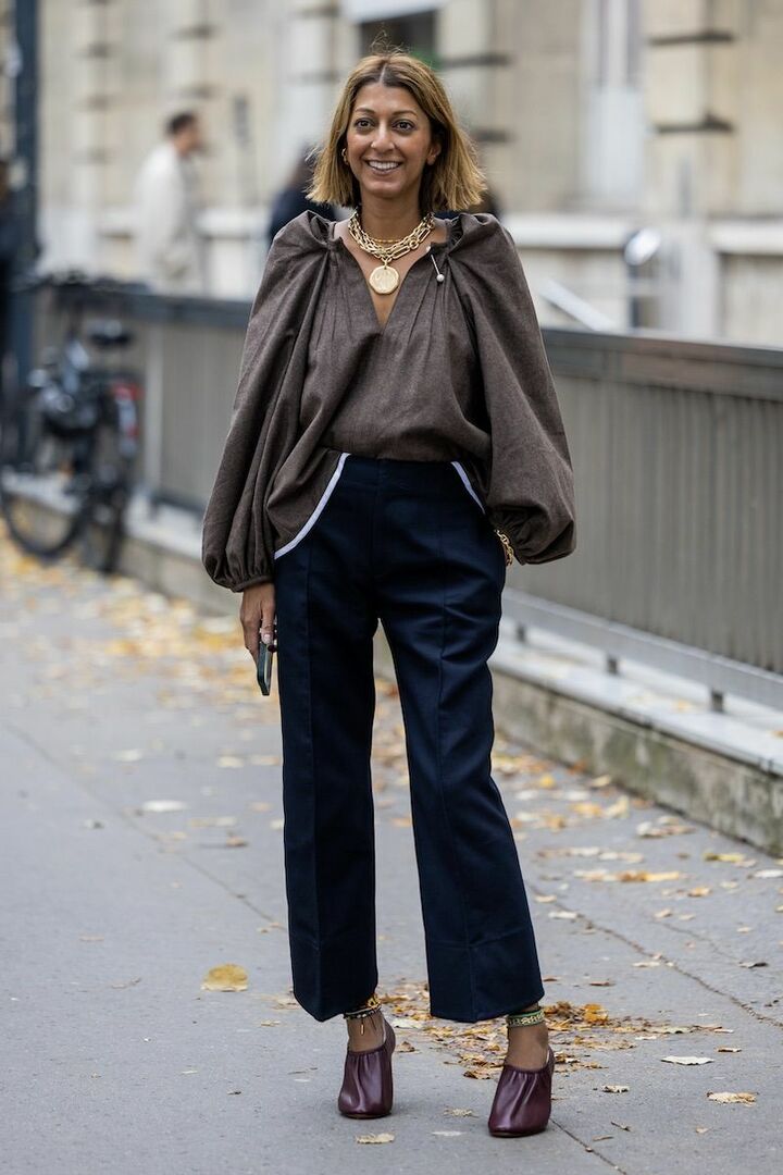 こっくりとしたブラウン、ノーブルなネイビー、マチュアなバーガンディでつくるシックな着こなし。ボリュームスリーブブラウスの裾をラフにインして、動きをプラス。さらにパンツにはセンタープレスが入っているため、立体感を引き上げることができます。