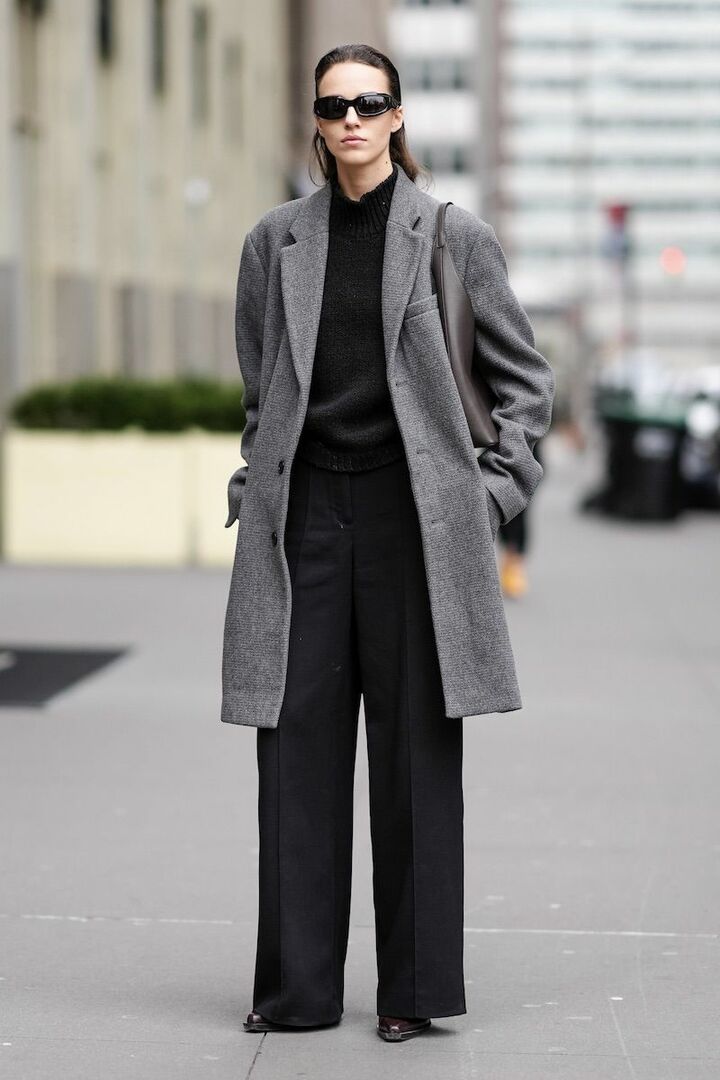 黒とグレーで構成するシックな着こなしは、ライトグレーを選び色の濃淡がしっかりと出るように。静かなカラーのなかでパンツのセンタープレスが映え、知的な印象にまとまっています。