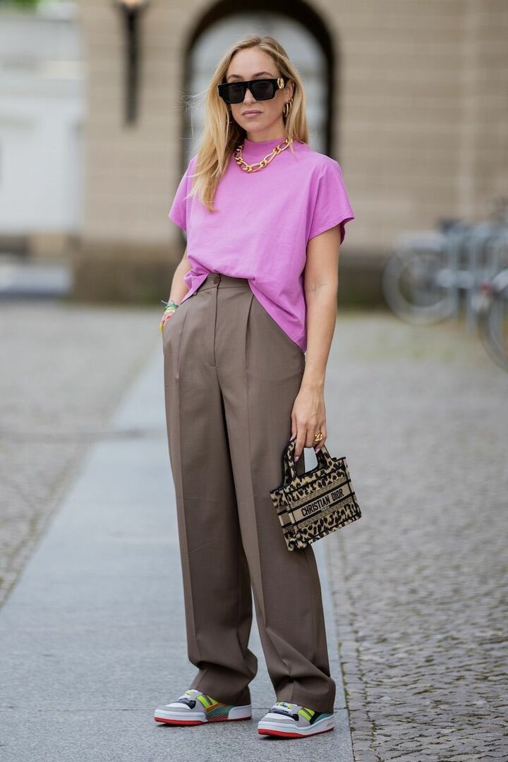 発色のよいピンクのパンツとカラフルスニーカーというポップな組み合わせも、あいだに上品なブラウンのセンタープレスパンツをかませればトゥーマッチになりません。さらにレオパード柄のバッグでスパイスをひとさじ加え、モダンに整頓。