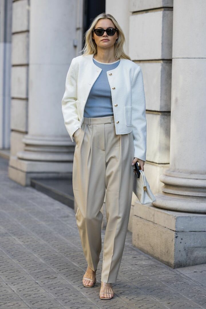 クルーネックのインナーに馴染ませるように、ノーカラージャケットを重ねて柔らかく。くすみブルーのカットソーとベージュパンツのニュアンス配色も、ぱりっとした白とパンツのセンタープレスが効いてメリハリしっかり。