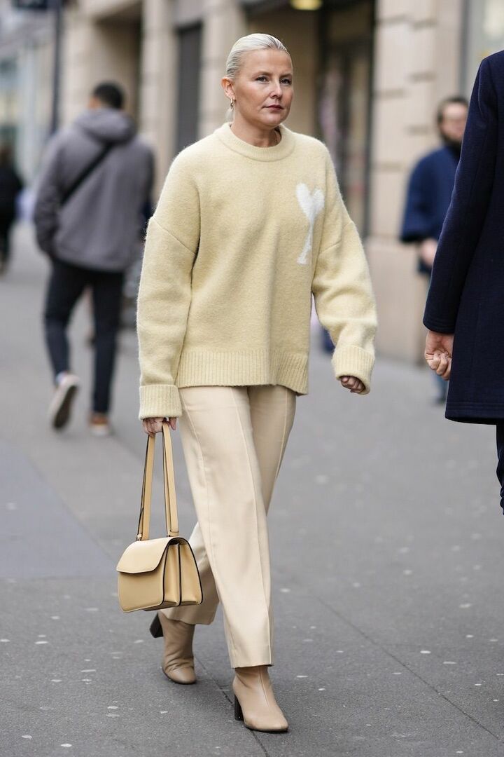 ニュアンスたっぷりなオールベージュコーディネートがぼんやりしないのは、わずかに色味を変えたり、異なる質感をミックスしているから。立体感に繋がるツヤブーツに裾がかぶらないよう、パンツはアンクル丈が吉。