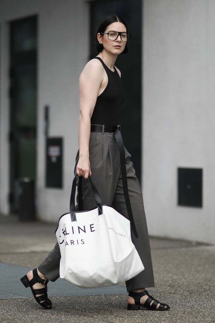 黒のアメリカンスリーブトップスとグレーワイドパンツのシンプルな着こなしに、ビッグサイズの白トートバッグを加えてキャッチーに。アンクル丈のパンツを選んでグルカンサンダルの存在感を引き立てると、リズミカルに着地します。