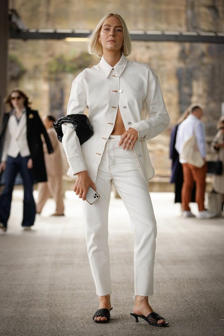 春の街中でオーラを放てるホワイトルックは、デニム素材に任せて親しみやすさを演出。ジャケットのボタンをたっぷり外しつつ、アンクルパンツにこだわって肌見せすればヘルシー。編み込みレザーとメッシュの黒小物が小気味よさに繋がって。