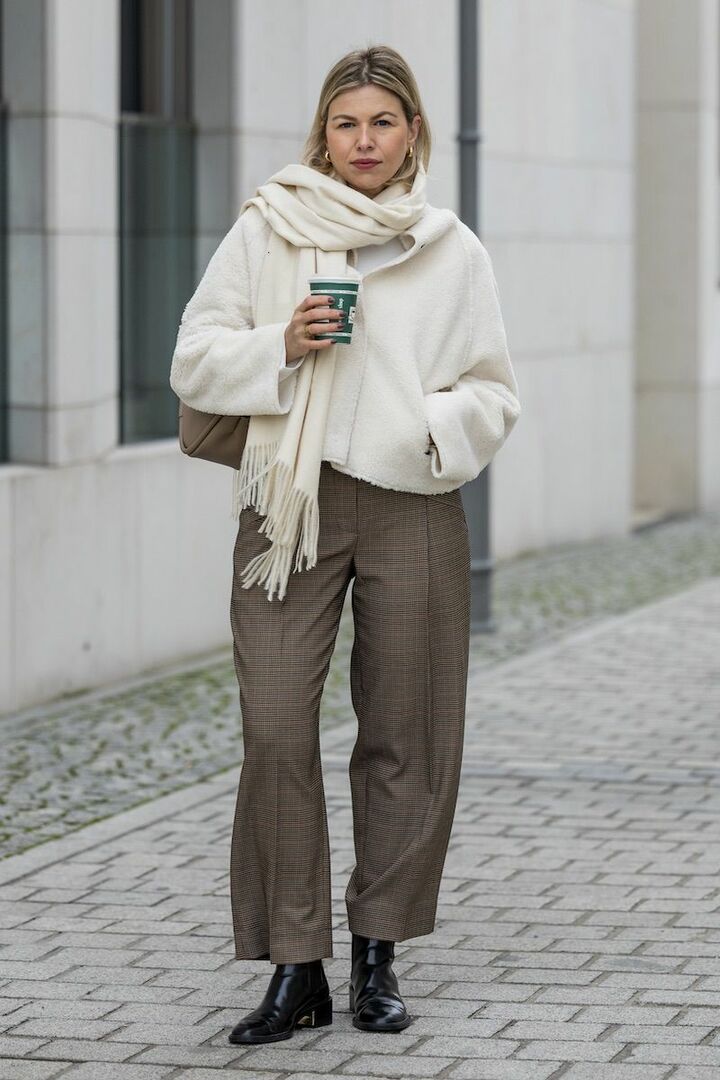 あたたかみのあるブラウンのチェック柄パンツに共鳴する、クリーミーな白のジャケットとストール。アンクル丈のパンツが黒ブーツの主張を強めてくれるので、ぬくもりコーディネートがほっこりする心配もなし。