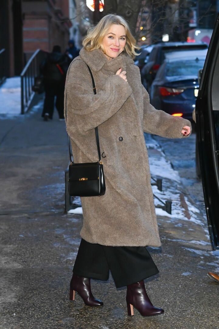 愛らしいモコモココートのぬくもりに包まれていたナオミ・ワッツ。コートのボリュームに負けないよう、黒のパンツはワイドシルエットをセレクト。アンクル丈なら軽快さが手に入り、すっきり見せることができます。さらにチゼルトゥのブーツを迎え、メリハリをオン。