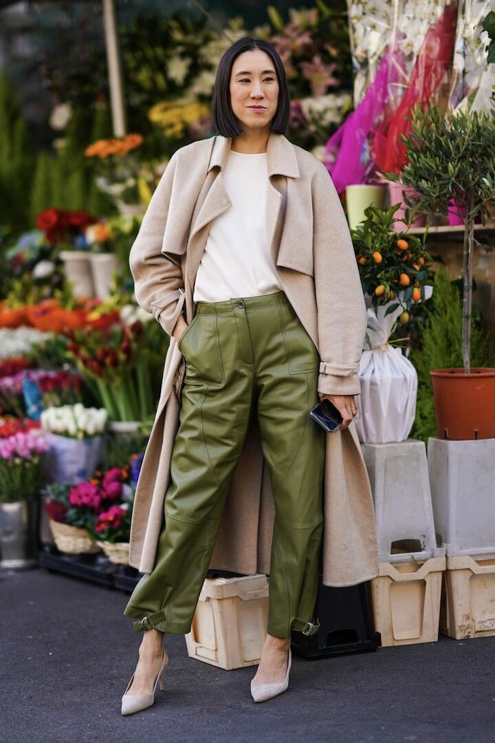 春の王道アウターであるベージュトレンチコートに、カーキのパンツをプラスしナチュラルな配色へ。ぴりっとスパイシーなレザー素材とアンクル丈のデザインならキレのよい表情に。白のトップス、ライトベージュのパンプスのように、明るいカラーを差して春らしく。