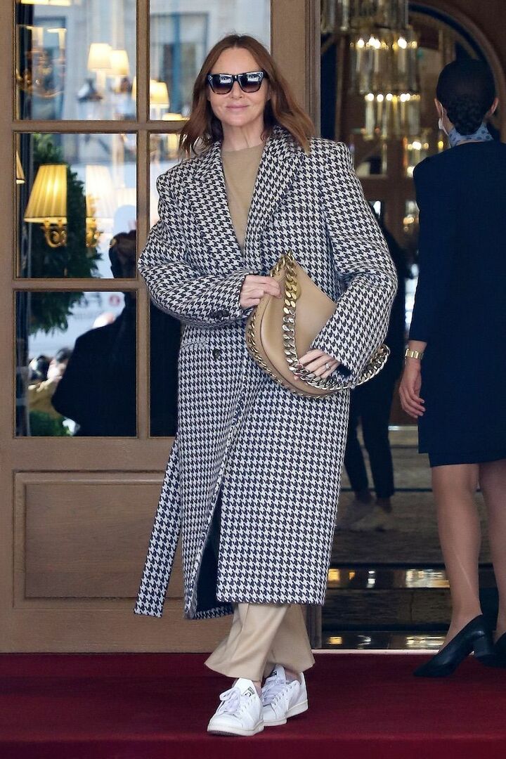 ベージュで繋いだ上下に、千鳥格子柄のコートを重ね、エレガントなオーラを放っていたステラ・マッカートニー。アンクルパンツと白スニーカーを使って、軽やかな足元を意識すると冬の装いが重く見えません。