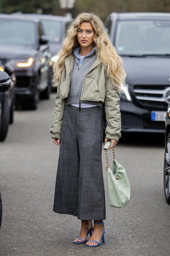 グレーとくすみグリーンをメインにした穏やかな配色に任せ、深まる季節を表現。静かなカラーが地味に見えないよう、アンクルワイドパンツに高発色のブルーサンダルを添えて切れ味よく。白の靴下を挟んでも好バランスです。