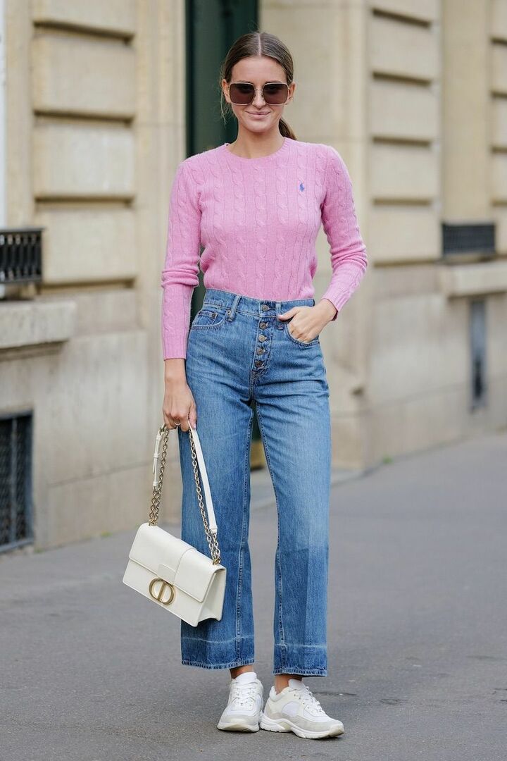 シーズンレスで活躍するブルーデニムパンツに、ピンクニットと白スニーカーを掛け合わせ春らしさを漂わせて。アンクルデニムパンツと白スニーカーのコンビなら、軽快さが高まって季節感を上乗せできます。