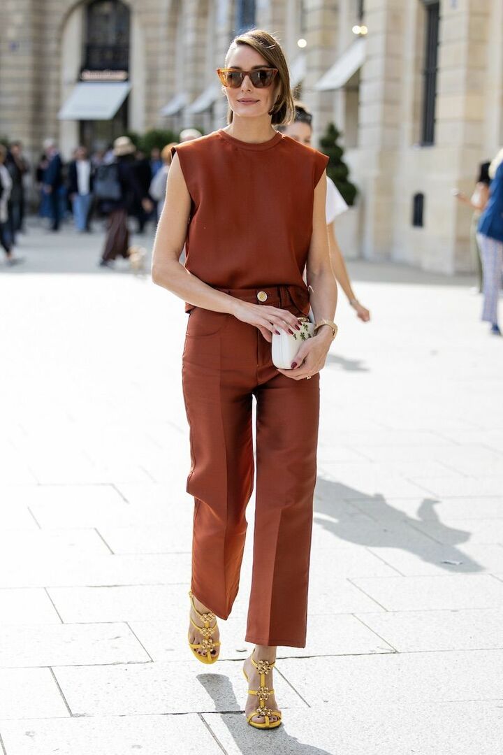 赤みブラウンのノースリーブトップスとパンツを着用していたオリヴィア・パレルモ。センタープレス入りのアンクルパンツが品のよさを高めます。露出した足元を飾るように、ビジューがあしらわれたボーンストラップのイエローサンダルを迎えぐっと華やかに。