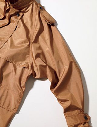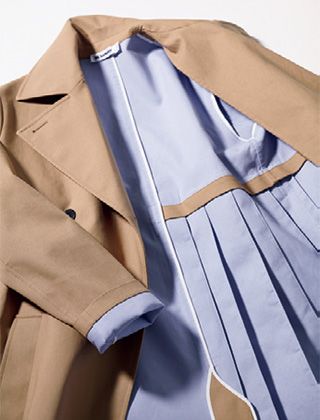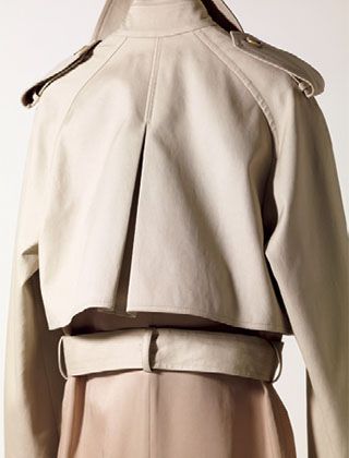 一見、オーセンティックなトレンチコート。でも、よく見ると、肩の部分が開いていたり、袖のベルトが二重巻きだったり…、細部にまでこだわった「遊び感覚」は、ヴァレンティノの真骨頂です。上半身は華奢な肩が印象的なコンパクトなつくりで、なんと隠しボタンによって、上下別々に切り離すことが可能。そして、高めのウエスト位置からストンと落ちる、足首がスレスレ見えるくらいのマキシ丈は圧巻です。色はグレーがかったドライなベージュ。ベルトをキュッと結んでタイトに着るもよし、フロントを開けてスポーティにはおるのもよし。着ていて楽しくなる一着です。