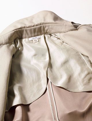 凛々しさとしなやかさ。その相反するふたつの要素を両立させることが、大人が目指すおしゃれの理想…。それを見事に体現しているのが、セリーヌのトレンチコートです。トップ部分は、カーキがかったベージュのダブルフェースコットン。エポーレットやガンフラップなど、典型的なトレンチのディテールを踏襲。それに対し、下部分は、落ち感のあるビスコース。わずかに艶のあるピンクベージュが流れるようなドレープを生み、全体から見ると、まるでドレスの上にコートを重ねているかのよう。異素材を合わせることで、甘辛バランスを極めた理想の美人コートです。
