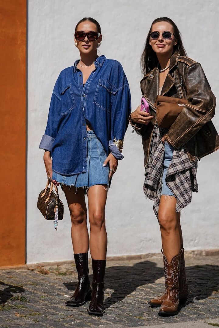 色に変化をつけたデニムオンデニムスタイルを成功させるべく、片方の面積を抑えめにしてすっきりと。チアフルなデニムミニスカートも、オーバーサイズのシャツで覆えば幼さをセーブできます。フィット感のある黒ブーツで引き締め、シックにまとめました。