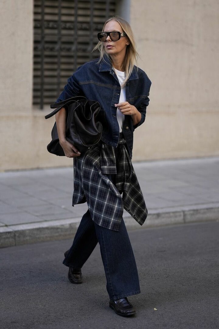 カジュアルな印象のデニムオンデニムスタイルも、濃紺をセレクトすればノーブルな印象に。インには白のカットソーを迎え、クリーンな色合わせへ。これだけでもコーディネートは完結しますが、チャックシャツを腰に巻いて躍動感をプラスすると着映えが叶います。バッグを抱えて持ったことも今っぽさに貢献。