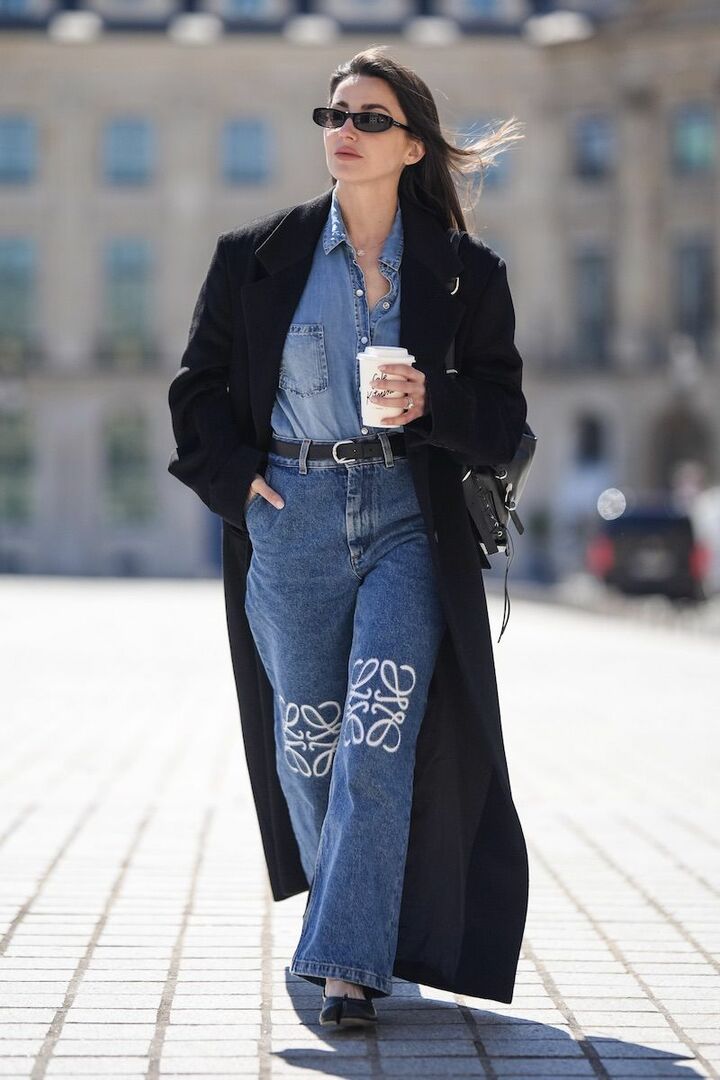 色を統一したブルーデニムの上下は、シャツの裾をインしつつ、ベルトマークして境界線を明確にしながら脚長に。黒のチェスターコートを重ね、Iラインを強調しクラスアップを実行。パンプスとバッグの上質なツヤもリッチ感を叶えます。