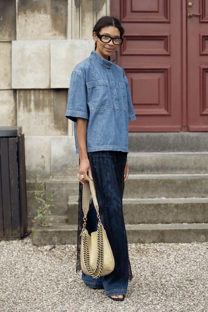 流れるようなグラデーションが美しいデニムオンデニムスタイルに、黒の総レースマキシスカートを投入してエレガンスを両立。スカートがふわっと風をはらむから、歩く姿が絵になること間違いなし。