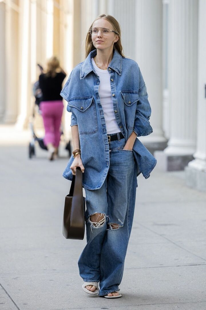 くたっとした形のブルーデニムシャツの抜け感を頼りに、色味を変えたデニムオンデニムスタイルを身近な存在に。ライトブルーデニムパンツのダメージ加工が好アクセント。フラットサンダルでこなれ感を引き上げつつ、ゴールドのジュエリーを散らしルーズにならないように調整。