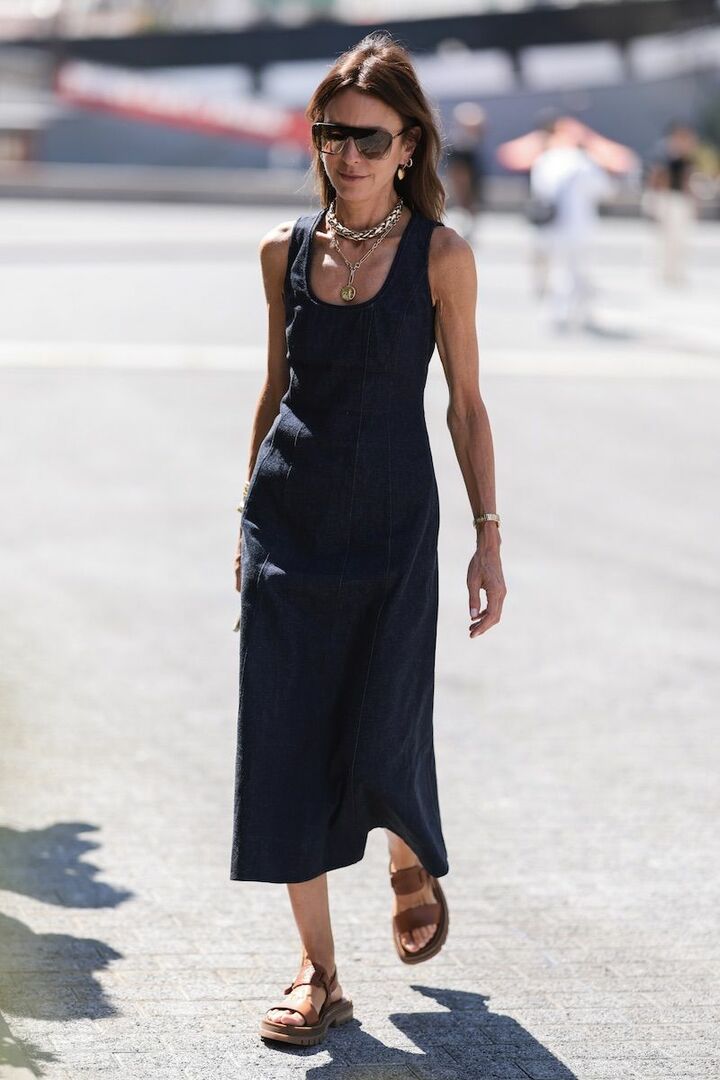 キレイを両立できる、濃紺のIラインデニムワンピースならカジュアルな装いでもけっしてルーズになりません。デザインの異なるネックレスをレイヤードしたら、足元はコンフォートサンダルで外してこなれ感たっぷりに。