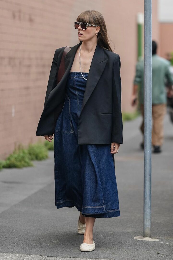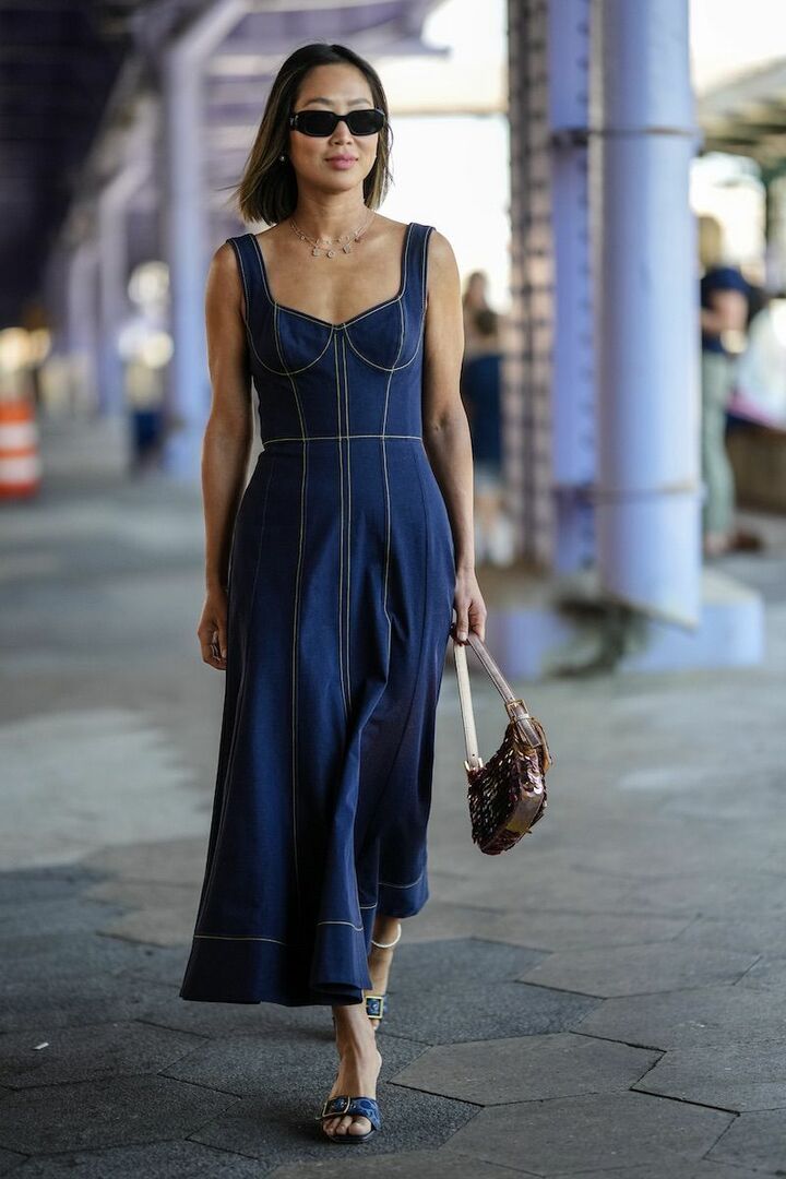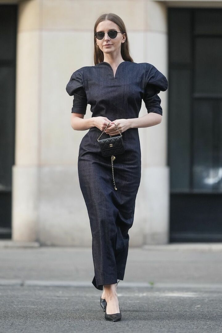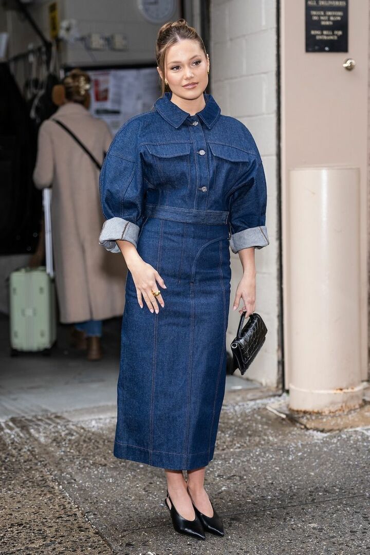 ボリュームスリーブとタイトシルエットがエレガントな、ダークブルーのデニムワンピースを着用していた俳優のオリヴィア・ホルト。パンプスや型押しバッグといった端正な黒小物を投入し、クラスアップに繋げました。かかとが覗くスリングバックパンプスがレディな印象を後押し。