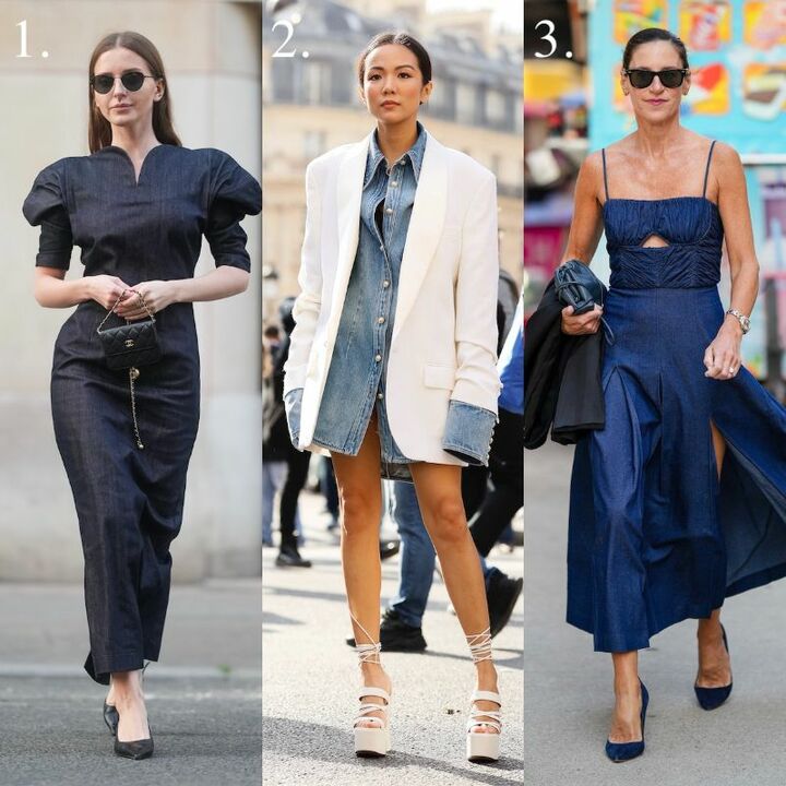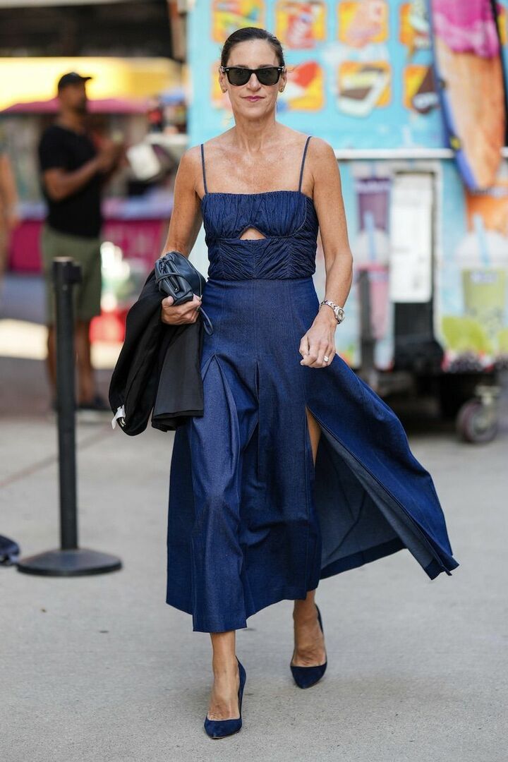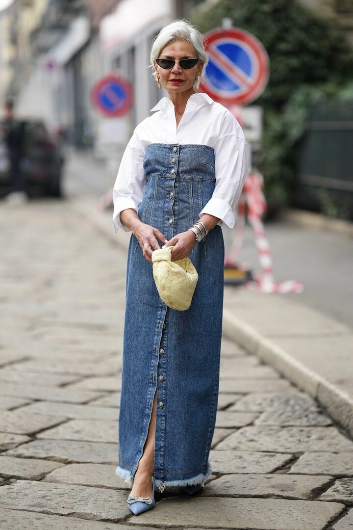 重ね着のアレンジが楽しくなるような、デニムのベアワンピース。エイジレスインフルエンサーのグレース・ガネムはブルーデニムの清楚さを引き上げてくれる白シャツを組み合わせて、きちんと感をアップ。柔和なイエローバッグと水色パンプスがクリーンな配色にマッチして、フレッシュさが漂っています。